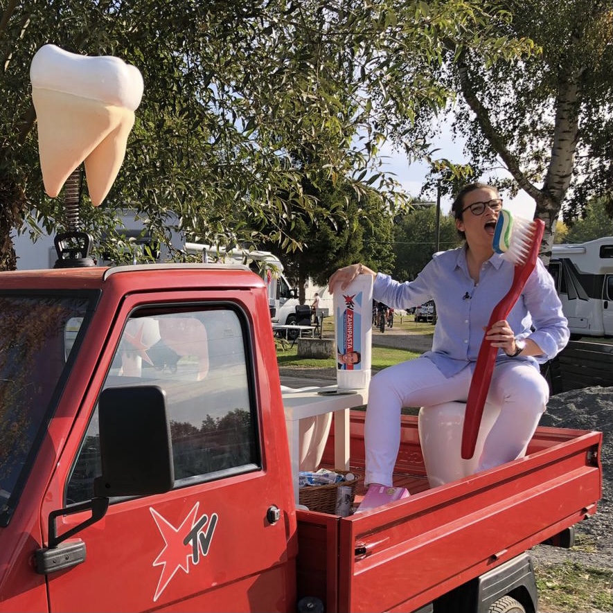 Im September hieß es dann noch einmal: „Stiftung Warentest hat getestet.“ Zudem scheine ich, wenn das Fernsehen nach einer kompetenten Fachfrau sucht, mir mittlerweile als Zahnputzfee der deutschen Fernsehwelt einen Namen gemacht zu haben. Dieses Mal wurde Zahnpasta getestet, und da mittlerweile die Hausbesuche nicht mehr möglich waren, haben sich die Jungs von Stern TV etwas ganz Tolles ausgedacht: Wenn wir die Menschen schon nicht im Badezimmer besuchen dürfen, weil die Abstandsregeln eingehalten werden müssen, wo finden wir dann Menschen, die sich nach Möglichkeit unter freiem Himmel die Zähne putzen? Richtig, auf einem Campingplatz. Wer also noch nicht gesehen hat, wie ich in einer Piaggio Ape mit einer überdimensionalen Zahnpastatube meine Runden drehe: Auch diesen Beitrag findet ihr auf den Social Media oder dem Streamingdienst von RTL.