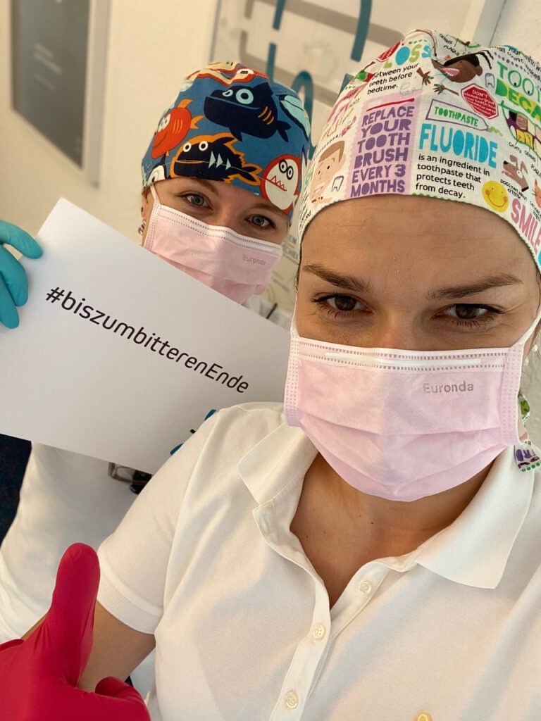Die Hygienemaßnahmen wurden verschärft, wenn das in einer Zahnarztpraxis überhaupt noch möglich ist. Vollvisiere und komplette Vollmontur an der Schutzausrüstung gehörten ab sofort zur Tagesordnung, was unsere gewohnt nahbare Kommunikation mit unseren Patienten um ein Vielfaches erschwerte. Ab sofort hieß es: Abstand halten; nur schwer durchführbar bei einem Zahnarzt.